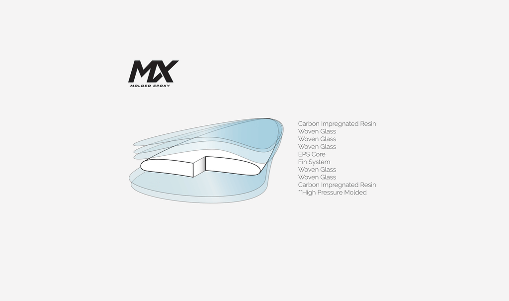 Molded Epoxy (MX) construction delivers structural integrity through the high pressure molding of multiple components. The components being; a medium density EPS core, 5 layers of Fiberglass (3 x deck, 2 x bottom) and a special epoxy resin that’s mixed with carbon strands. Encapsulating the whole board, and forming an outer skin that bonds through to the core, this combination of materials is fused together for over 4 hours under constant heat and pressure. The result is a very durable, well weighted board, and the high pressure molding process ensures that each board is identical to our specifications.